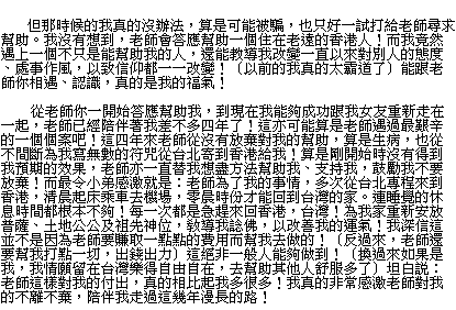 ★ 網主助人挽回感情之真人真事實例,提供您分享 ★ 香港麥克先生第一次專程從「香港」來「台」拜訪網主時、彼時香港麥克先生之「印堂」已呈現暗黑色,顯然正逢霉運、必有不吉事發生之兆,顏面已呈凶神惡煞之相,一旦碰上了「凶神惡煞」、寧可敬而遠之,然、網主見香港麥克先生善根深厚故而答應助之。 網主雖答應助麥克先生已斷訊失聯之感情,但網主特別強調:「很難挽回」一定會拖很長時間,因為女方早已移情別戀、欲破鏡重圓絕非易事,網主也特別強調:「信得過我 經香港麥克先生認同後、網主隨即施予法術,爾後為其改善香港住家之風水格局助運 網主猶然記得在未成功完成香港麥克先生所託付之高難度感情問題時,網主一再向香港麥克先生保證一定成功,網主一再豉勵香港麥克先生持續加油、多體恤別人,所幸香港麥克先生皆能接納網主建言,三年多來香港麥克先生已由霸君、變成君子,乃是其福氣。 經網主助香港麥克先生改善心念後、麥克先生已由「凶神惡煞相」變成「慈眉善目相 網主堅心助麥克挽回感情,相信全球數術從業者沒幾位能像網主不計得失「一言九鼎 有志者事竟成!任何人遭遇困惑時得先自省、改過遷善,而後設法解決困惑脫離困惑 香港喜訊之男主角麥克先生的來信隻字未改,原文呈現